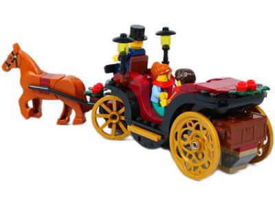 A festive carriage – The LEGO® Wintertime Carriage Ride (40603) has a dark red interior, golden wheels and a trunk at the back for storage