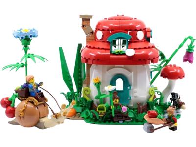 My Mushroom House is 22.5 cm tall and consists of 964 pieces. It makes a great display piece from the front and reveals an inviting interior on the backside. The 3 Minifigures included are two Forest Elves and the fruit merchant on her snail mount.
