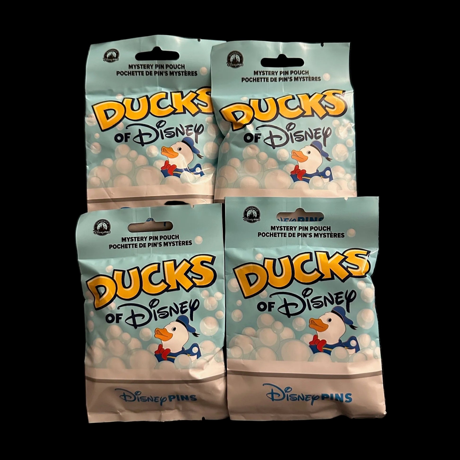 This 16-pin DUCKS OF DISNEY mystery set was released in December 2024. Each pouch contained five random pins. The pins are shaped like classic "bathtub rubber duckies" and themed after different animated Disney characters. The yellowish-orange beaks are the only detail that remains unchanged, and all the ducks point in the same direction.