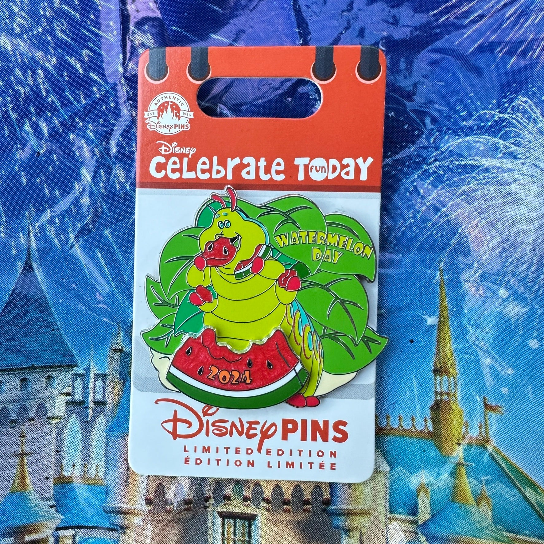 Released at WDW and DLR in July 2024, this pin celebrates National Watermelon Day (August 3). Heimlich the Caterpillar from the Pixar film, A BUG'S LIFE, is seen standing behind a large slice of red watermelon. He is eating a chunk of melon. There are large green leaves in the background featuring WATERMELON DAY in yellow block letters. The date 2024 can be seen on the watermelon slice near the bottom of the pin.
