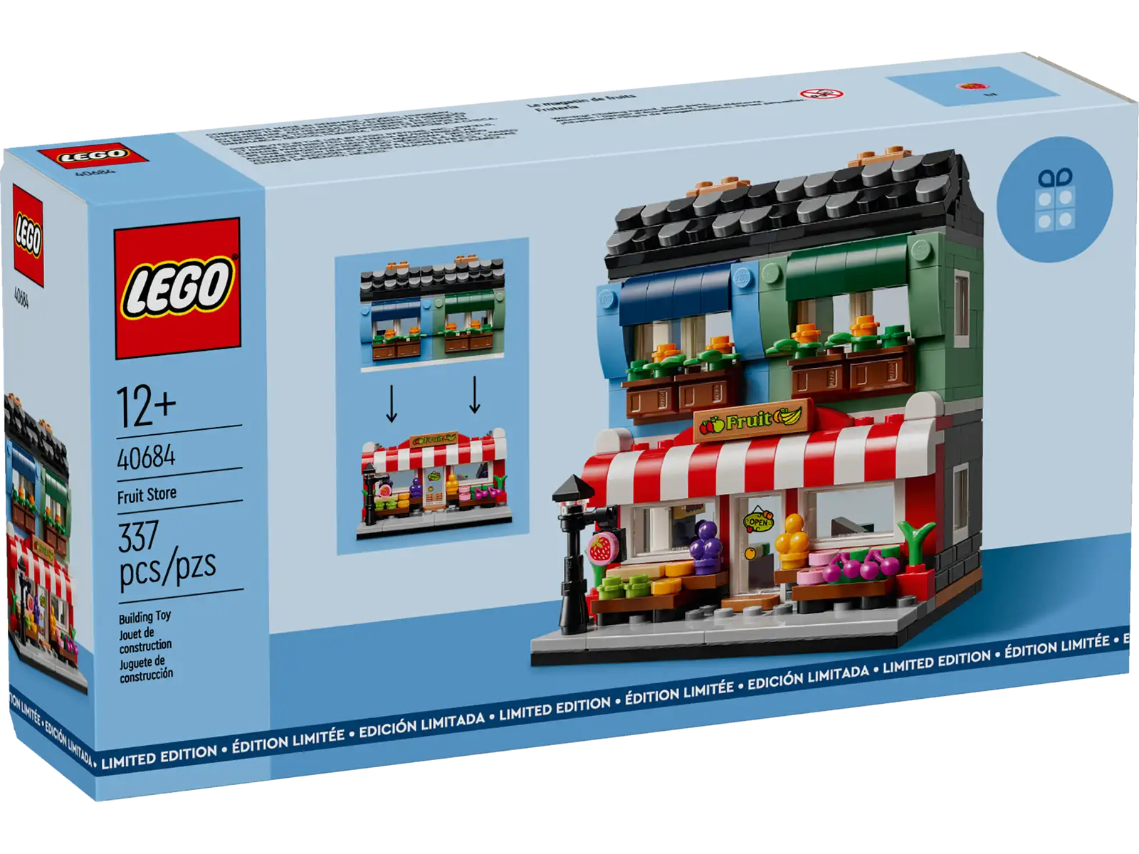 Welcome to the LEGO® Fruit Store. Built at mini-scale, this displayable collectible toy is the second in a series of 4 model LEGO stores for adult and teen builders aged 12 and up. Admire the architectural features on the front of the store, then turn it around to explore an interior packed with a bounty of colorful fruits. Above the store is a welcoming apartment, and the building is modular so you can display it as a 2-story building or place the levels side by side.