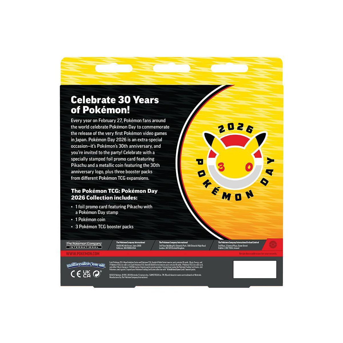 Celebrate with a specially stamped foil promo card featuring Pikachu and a metallic coin featuring the 30th anniversary logo, plus three