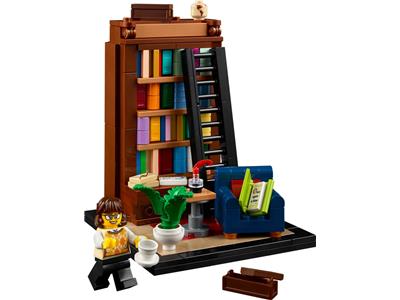 Bookish charm Bookworms can build the LEGO bookshelf, which features an integrated desk, ladder and lots of colorful books, as well as a globe and jar with ink